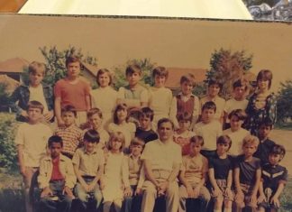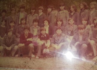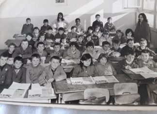 На фотографијата учителката Мирјана со своето одделение(38 ученика)во 1974 година