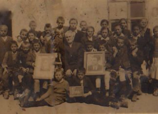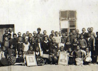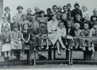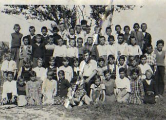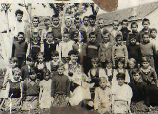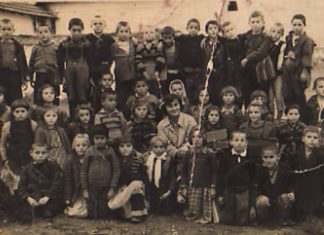 *Учителката Анче Трендафилова-Дејановска со своето одделение,1955г.,во позадина е првата училишна зграда во Илинден.