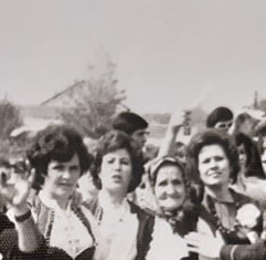 На фотографијата Бабата Божа Дончевска со своите внуки од ќеркаи Милица, Рада и Невена во народна носија . Фотографија од 1978 година.