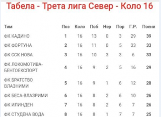 Ф.К.„Кадино“ од Кадино- Илинден и по 16-то коло во третата фудбалска лига -север, цврсто се држи на врвот на табелата.