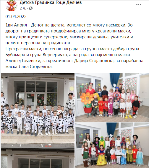 ИсторијатОбразование низ времето Априлијада-2022 во Илинден Од страна на Драги - 01/04/2022 0 Денес во сите Основни и подрачни училишта ,како и во Градинката Гоце Делчев во Илинден видовме многу креативните дечиња кои што ги подготвија маските по повод денот на смеата и шегата.