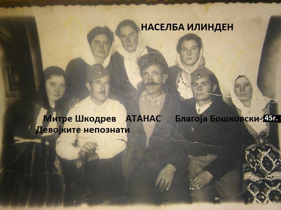 Благодарност до Boban Mitrovski Mitrovski за испратената фотографија, направена непосредно по ослободувањето во 1945 година . На истата во средината Атанас Митровски, десно од него Митре Шкодрев ,лево Благоја Бејтовски.Тукушто завршената војна оставила траги да делови од облеката како што се гледа(капите) Девојките не познати.