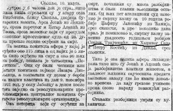 За оваа објава користен е извадок од „Политика“од 1921 година и пишан прилог од Слободан Тргачевски ,потомок на бројниот род Тргачевски од Кадино.