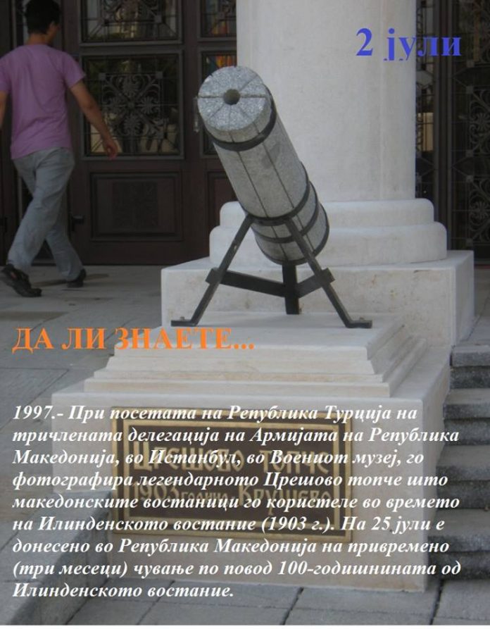 *2 јули 1997.- При посетата на Република Турција на тричлената делегација на Армијата на Република Македонија, составена од полковниците Гоце Илиевски и Ѓорѓи Ѓуровски, како и мајорот Ванче Стојчев, во Истанбул, во Воениот музеј, мајорот Ванчо Стојчев го пронајде и го фотографира легендарното Црешово топче што македонските востаници го користеле во времето на Илинденското востание (1903 г.). На 25 јули е донесено во Република Македонија на привремено (три месеци) чување по повод 100-годишнината од Илинденското востание.