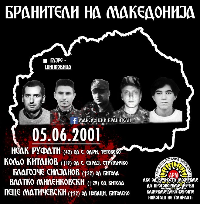 * 5 јуни 2001 на патот Шипковица – Гајре, во заседа загинуваат 5 припадници на АРМ. Загинаа:
