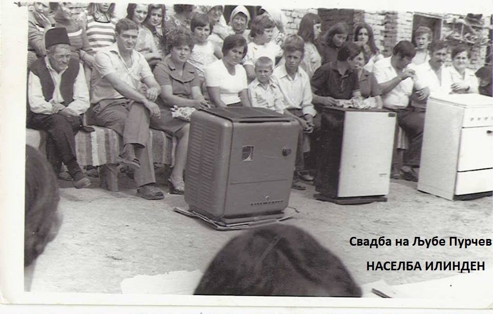 Фотографија од свадбата на Љубе Саздовски(Пурчев)-1973 година.МОМЕНТ ОД ЧИНОТ НА ДАРУВАЊЕ,.Кумот.Старосватот,Деверот и тн. ,На сликата Миле Ѓуровски-старосват,кумот и деверот со нивните поклони пред нив, се работи за две нафтени печки и еден електричен шпорет..Десно со шубара е највозрасниот член од родот Пурчеви.Дарувањето е особено важно за сеирот-насобрани граѓани кои гледаат кој каков поклон донел ,ама и со каков бакшиж ќе биде даруван од невестата.