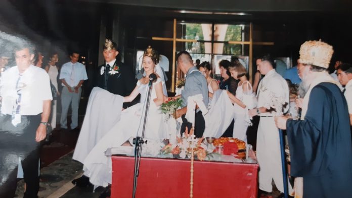 Фотографија од венчавањето на Горан и Јасмина, изведувајќи го чинот на Трикратното вртење околу масата.Инаку Горан е од родот Дончевци од Илинден ,а Јасмина од с.Зубовце -гостиварско.