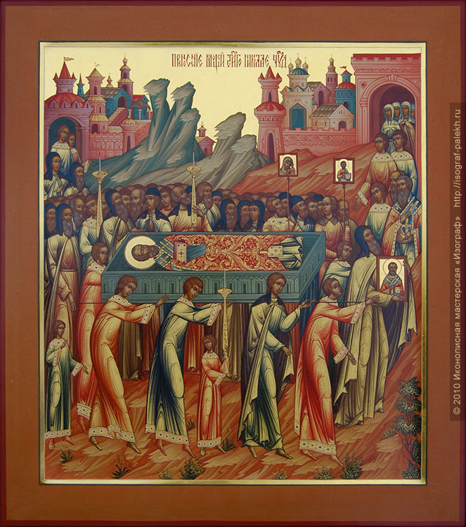 Пренос на моштите. Во времето на царот Алексеј Комнен и на патријархот Никола Граматик, во 1087 година телото на овој светител беше пренесено од Мир Ликиски во градот Бари во Италија. Тоа се случи заради навалата на муслиманите на Ликија.
